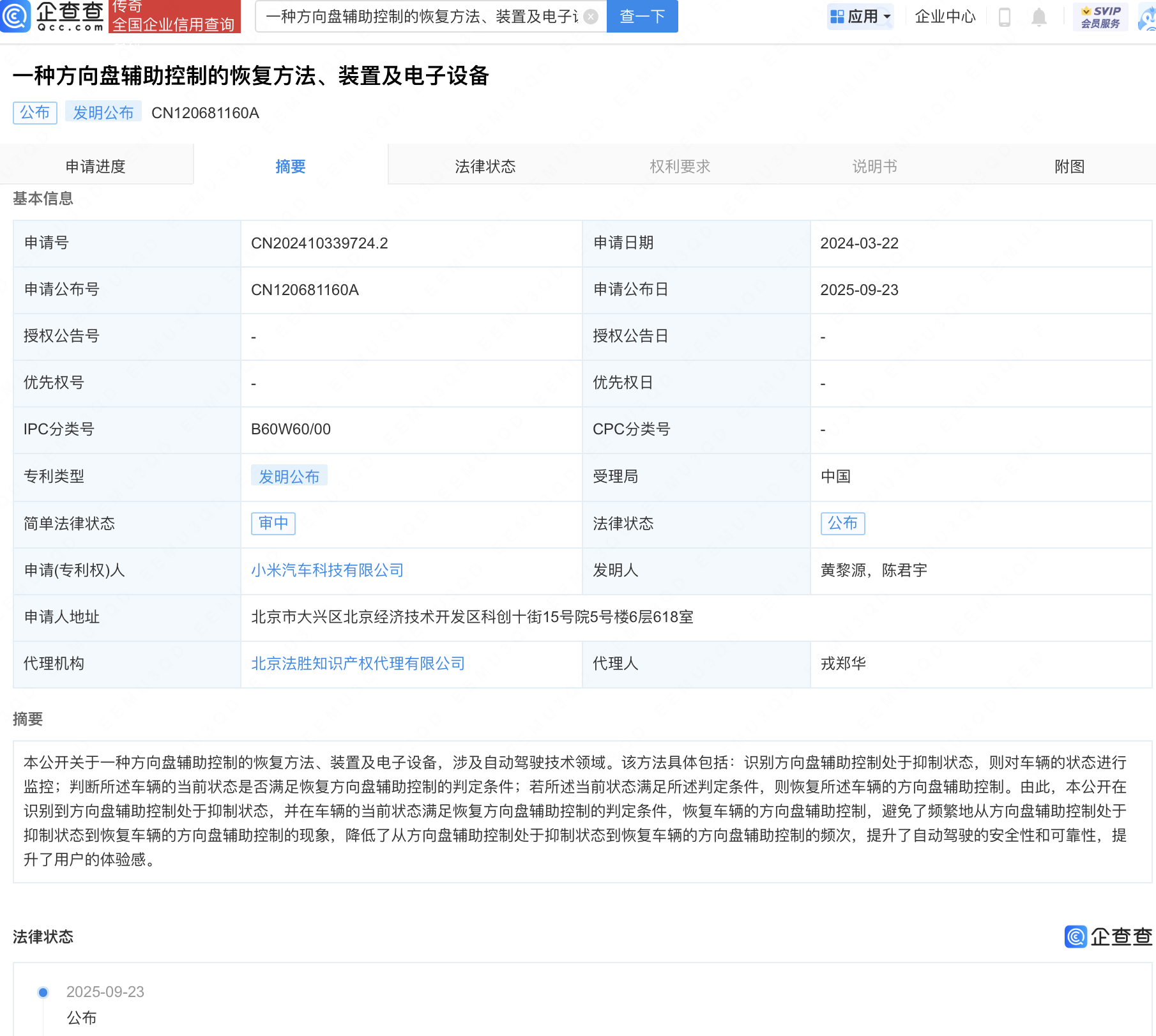 近日,小米汽车科技有限公司“一种方向盘辅助控制的恢复方法、装置及电子设备”专利公布。企查查专利摘要显示,本公开涉及自动驾驶技术领域,方法具体包括:识别方向盘辅助控制处于抑制状态,则对车辆的状态进行监控;判断所述车辆的当前状态是否满足恢复方向盘辅助控制的判定条件;若所述当前状态满足所述判定条件,则恢复所述车辆的方向盘辅助控制。由此,本公开在识别到方向盘辅助控制处于抑制状态,并在车辆的当前状态满足恢复方向盘辅助控制的判定条件,恢复车辆的方向盘辅助控制,避免了频繁地从方向盘辅助控制处于抑制状态到恢复车辆的方向盘辅助控制的现象,降低了从方向盘辅助控制处于抑制状态到恢复车辆的方向盘辅助控制的频次,提升了自动驾驶的安全性和可靠性,提升了用户的体验感。